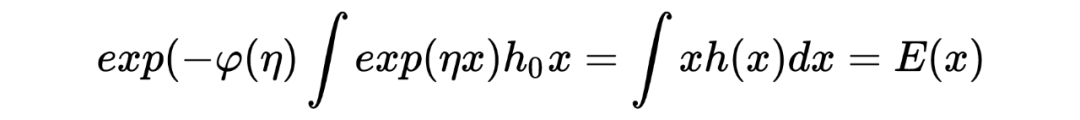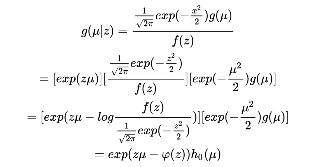 在此处,先验分布 形式不清楚的情况下,我们无法给出后验分布的解析形式。但此处我们的目标是后验分布的期望,可以通过 exponential family 及其中的 cumulant generating function 巧妙地推导而来。 对于 exponential family 中的分布而言,其概率密度函数可以写成以下形式: