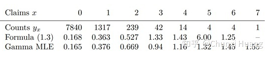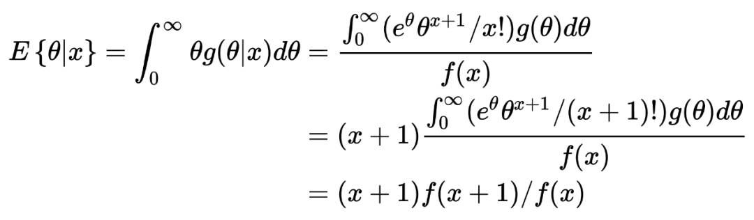 4. 有一点需要注意的是,在上文汽车保险公司例子的表中,第三行所示为利用 Robbins' formula 得出的估计结果,我们发现当 的值变小的时候(表的右侧),这种估计好像出问题了。个人认为这与数据分布本身有关,毕竟从概念上来说,经验贝叶斯的先验分布来源于观测数据本身。而与之相反的则是表中第四行假设先验分布 为 gamma 分布得出的估计值,相较之下更为稳定。