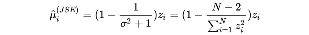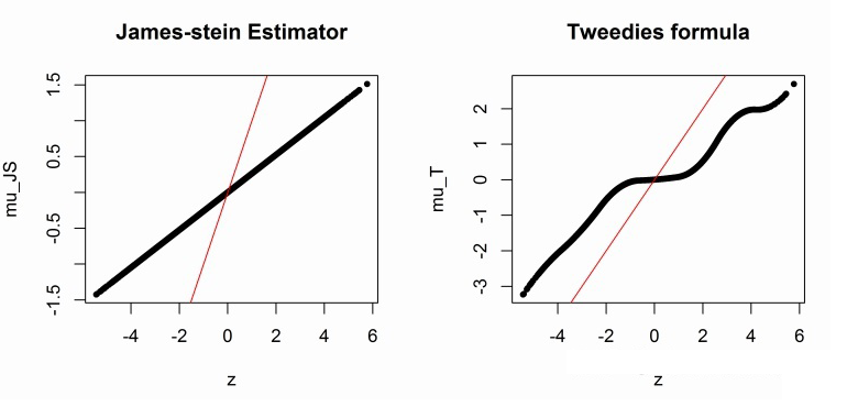 而经验贝叶斯中的两个重要节点:之前所提到 James-Stein estimator 的和本文分享的 Tweedie's formula 则惊奇地有与 Ridge 和 Tweedie's formula 相似的效果。如下图所示,黑色为 JSE 和 Tweedie's formua 的估计值,红色线为 。
