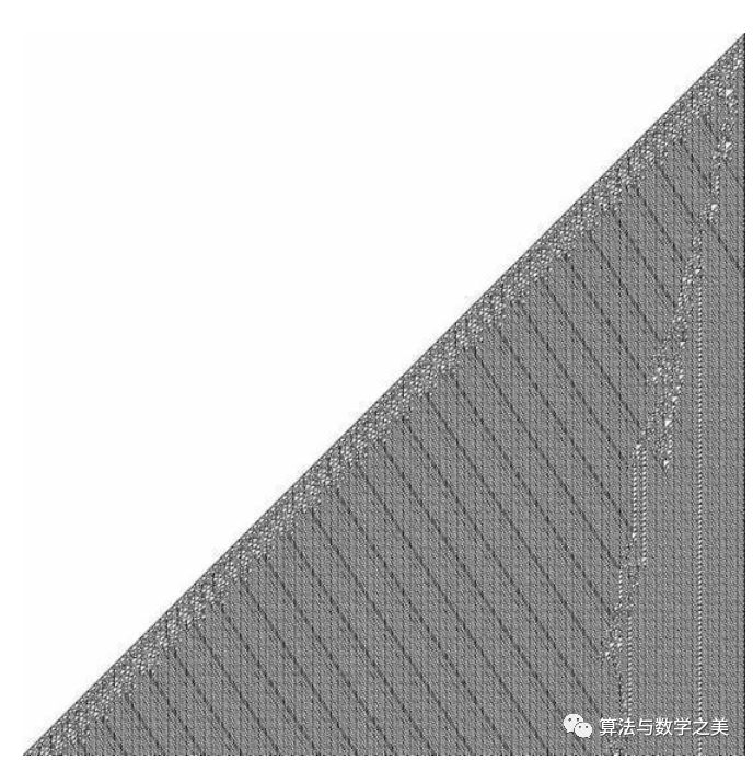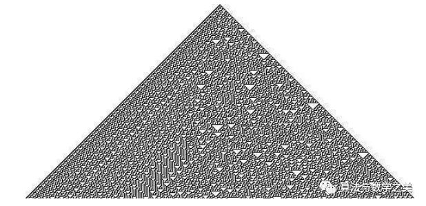 可是沃尔夫勒姆却觉得自己发现了某种本质的东西。1983年,他做出了自己最得意的发现:“Rule 30”。这是一套规则组,处理的是更加简单的一维细胞自动机,每一次迭代的产物变成新的一行打印在下面。可是,从一个活细胞出发,它却生成了一套极其复杂的无尽花纹;后来Mathematica里使用的随机数生成器,就是基于Rule 30的。(顺便说,用Rule XX指代一维细胞自动机的规则组,这一用法是沃尔夫勒姆首创,沿用至今。)