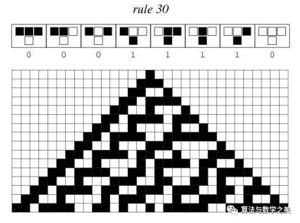 Rule 30的全部规则,以及从一个黑点开始的迭代结果。每一次新的迭代就是新的一行,而每一个细胞的死活由且仅由它自己和它左右两侧的细胞在上一行的状态决定。之所以是30,因为按顺序排列的二进制数00011110对应的十进制就是30。