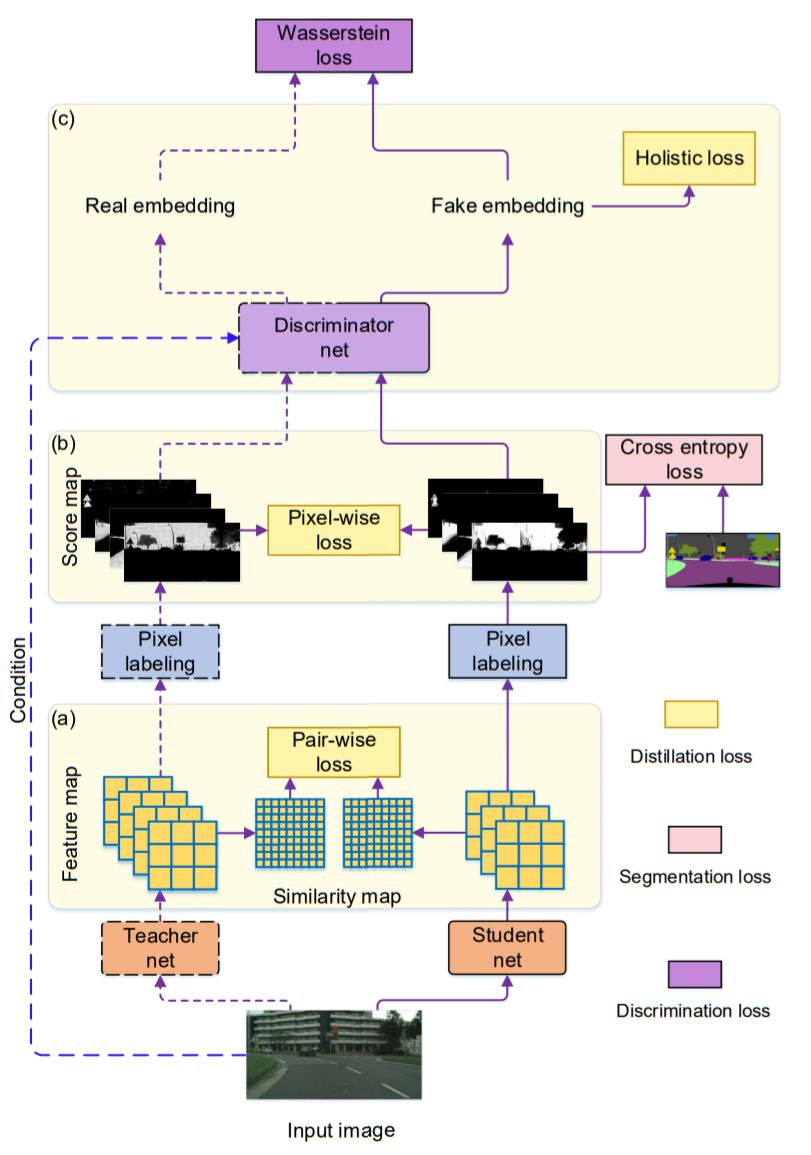 另一种更高层次的结构化信息是来自对图像整体结构相似性的度量,作者引入了对抗网络的思想,设计专门的网络分支分类Teacher网络和Student网络预测的结果,网络收敛的结果是该网络不能再区分Teacher网络和Student网络的输出。作者称这块损失函数为Holistic loss(整体损失)。