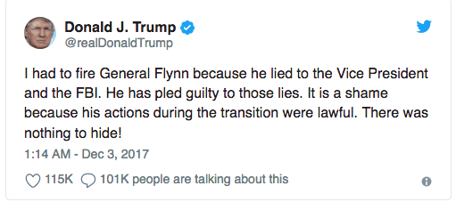2017年12月1日,迈克尔·弗林(Michael Flynn)承认向FBI撒谎了。12月3日,川普的个人推特账号发了这样一条推: