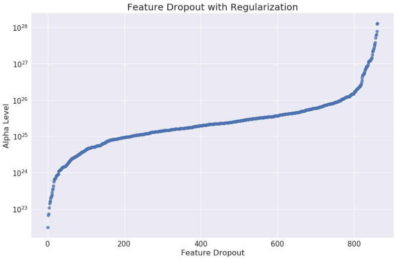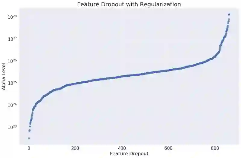 我进行的最重要的任务之一是根据对模型输出的影响的数量级排序特征。为了排序,我使用了scikit learn的Ridge分类器。Ridge回归是一种包含正则化因子(alpha)的逻辑回归形式。alpha为零时,ridge回归和普通的逻辑回归一样;alpha值较低时,ridge回归迫使影响力最低的那些特征的系数为零,实际上将这些特征从模型中移除了;alpha值较高时,更多特征被移除了。我递归地迭代每个alpha级别,逐一移除特征,直到所有特征都被移除了。