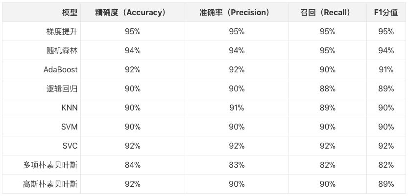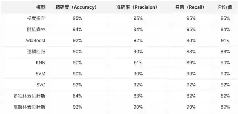 我总共创建了9个模型:高斯朴素贝叶斯、多项朴素贝叶斯、K近邻、逻辑回归、支持向量分类器、支持向量机,以及集成方法AdaBoost、梯度提升、随机森林。每个模型在训练数据上使用10折交叉验证精心调优,并在测试数据上进行了评估。