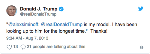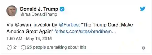 事实上,我的模型中最紧要的特征之一就是引用转推。看起来川普不知道如何在推特上转推别人的推文。在整个33000条推文的语料库中,仅有一条来自Android设备的方法正确的转推。在其他转推中,川普复制别人的推文,@用户,然后用引号包围推文,然后自己发布: