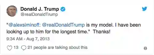 这些转推经常(并非总是)是像这样的自我庆祝推文。在本文后面讨论结果的部分,你会看到,川普倾向于大量@自己,其原因就是这样的转推。