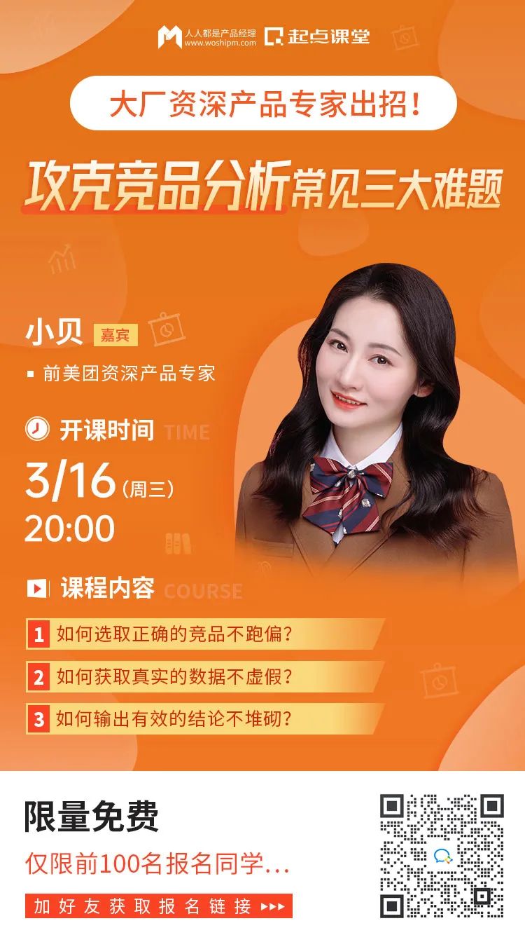 别慌!我特地为你准备了直播福利课,针对产品新人解决在竞品分析中存在的信息获取难、功能拆解难以及数据分析难等具体问题,帮助你避开竞品分析中的误区,做有价值的竞品分析,为你的面试求职助力!