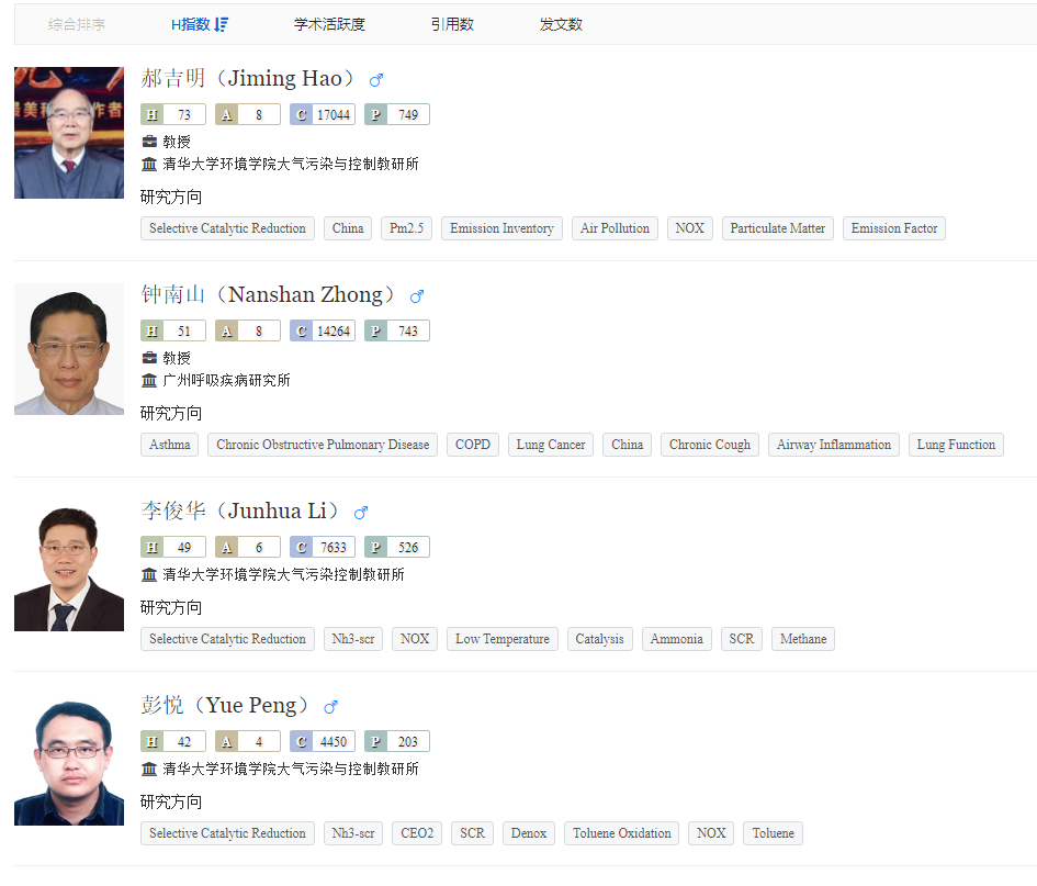 在主界面上,以 H(H 指数)、A(学术活跃度)、C(引用数)、P(发文数)四大维度来展示学者的研究指数,同时提供个人基本信息及研究兴趣。