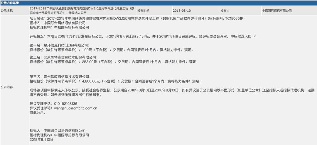 2017-2018年中国联通总部数据域对内应用DW3.0应用软件迭代开发工程(数据仓库产品软件许可部分),项目预算金额:1.16万元/节点。最近对外公示中标候选人,中标结果公示:星环科技、思特奇、易鲸捷投标价格分别为 1元/节点、253元/节点、4800元/节点。也就是最多464万元的项目,星环科技400元中标。