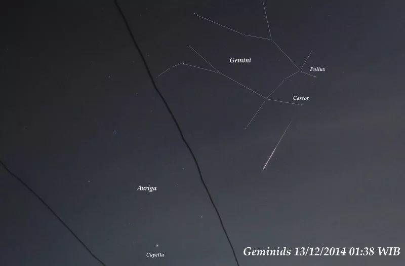 2017年12月初 Martin Marthadinata在印度尼西亚爪哇岛东的泗水上传了这张照片。他写道:“再过几天双子座流星雨就到极大值了(12月13日—14日)。2014年的时候,我拍到一颗从北河二附近的辐射点飞出来的火流星,实在是太震撼了!”
