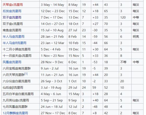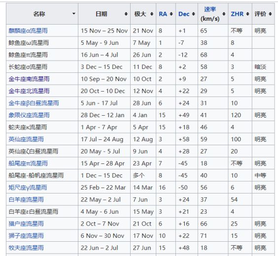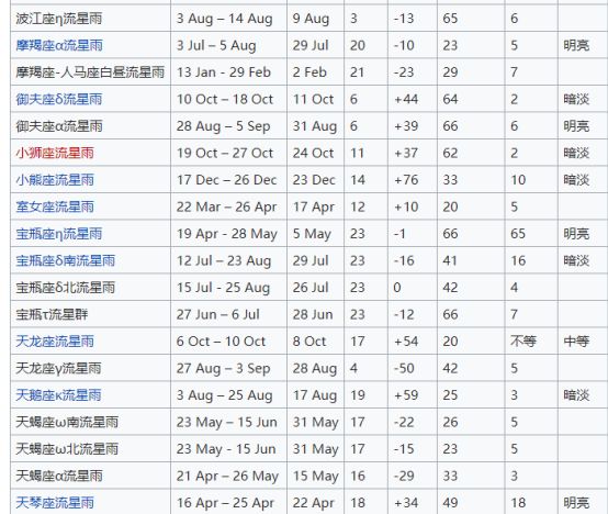 有,而且很多。下面是常见流星雨的列表,看看有没有自己的星座吧~