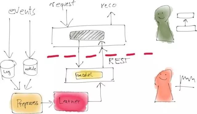 开发系统和数据科学系统之间的最主要区别可能在于,开发系统是持续运行的实时系统。数据必须得到处理,模型必须不断更新。输入事件也常常被用来计算点击率等关键绩效指标。模型经常每隔几小时就使用可用数据重新训练一次,然后加载入开发系统中,通过采用REST架构的接口提供数据。