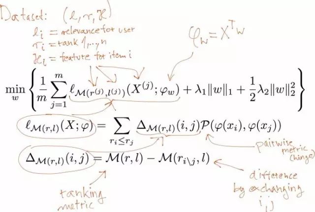 还有更简单的一些方法,基本只通过计数来生成推荐,但在实际操作上,这类方法的复杂度几乎没有上限。例如,就个性化推荐而言,我们一直在研究对从各种角度对商品进行排序的机器学习排名方法。上图显示的是用于优化这一方法的成本函数,主要是为了说明数据科学有时具有的复杂程度。该函数采用包含正则项的对偶加权排名指标。虽然在数学上非常精确,但也非常抽象。这种方法不仅能用于电子商务领域的推荐,还能用于解决各种各样的排名问题,前提是排名对象具备适合的特征。