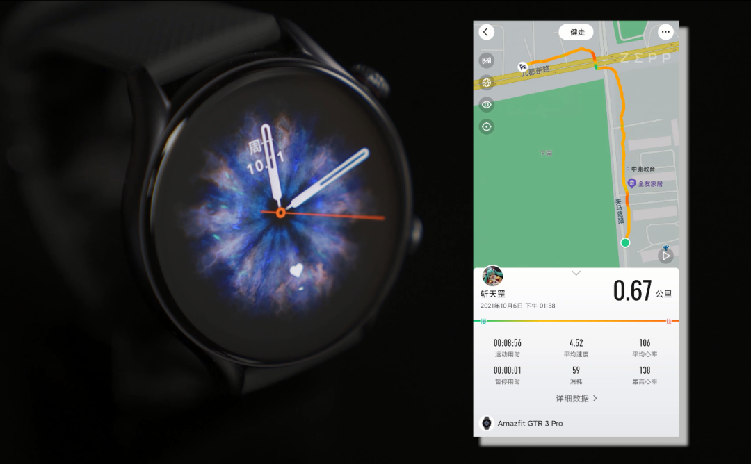 运动监测方面,GTR 3 与 GTS 3 均可以做到 50 米专业防水以及水下心率监测,并有超过 150 种运动模式更是可以满足用户的各类运动需求。运动定位,这次除了我们熟悉的北斗、GPS、GLONASS、Galileo 四星之外,华米还额外增加了 QZSS 卫星定位,覆盖更加全面。在室外,搜星速度一般在 8-10 秒左右,表现优异。