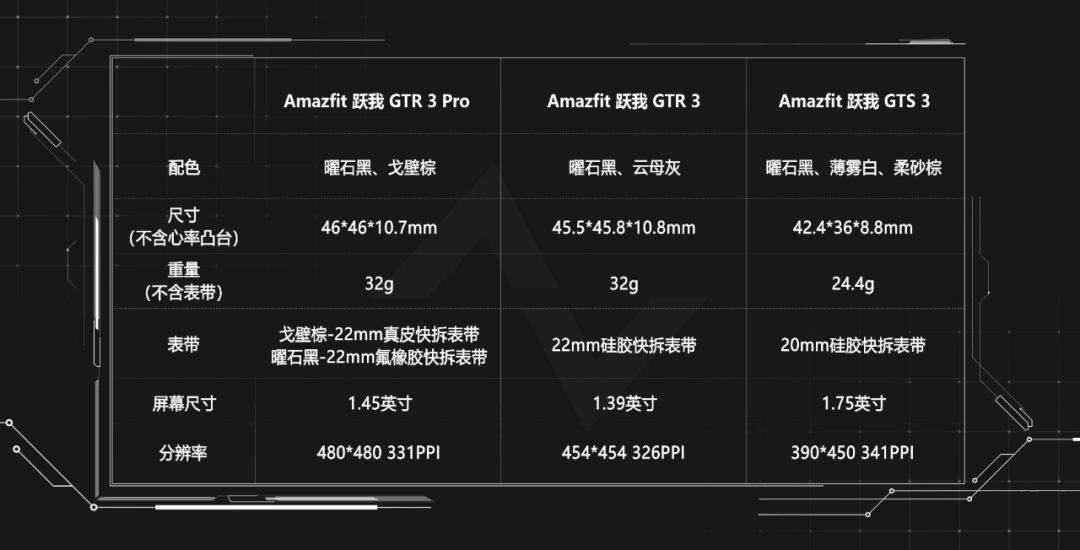 跃我 GTR 3 与 GTS 3 在功能配置方面,基本相同,两者的区别在于手表形态与续航。可以简单理解为 GTR 3 系列更适合男性用户,GTS 3 系列更加轻薄小巧,更适合女性用户。另外 GTR 3 系列还有一款 Pro 版本,采用了更大尺寸的屏幕、表带更换为氟橡胶,内置麦克风和扬声器,最重要的是加入了在今年 7 月份华米技术大会中正式亮相的血压监测功能。