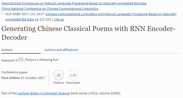 这篇论文介绍了,中国古典诗词的生成作为一个序列到序列的学习问题,并通过各种定性分析研究循环神经网络(RNN)对诗词生成任务的适用性。研究人员建立了一个基于RNN编码器-解码器结构的新型系统,以关键词为输入,可以生成四行诗,也就是常说的绝句。系统可以学习单句中的语义,诗中各句之间的语义相关性,以及利用结构、节奏和音调模式之间关联性,无需使用任何约束模板。实验结果表明该系统也优于其他竞争系统。
