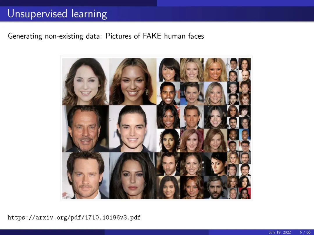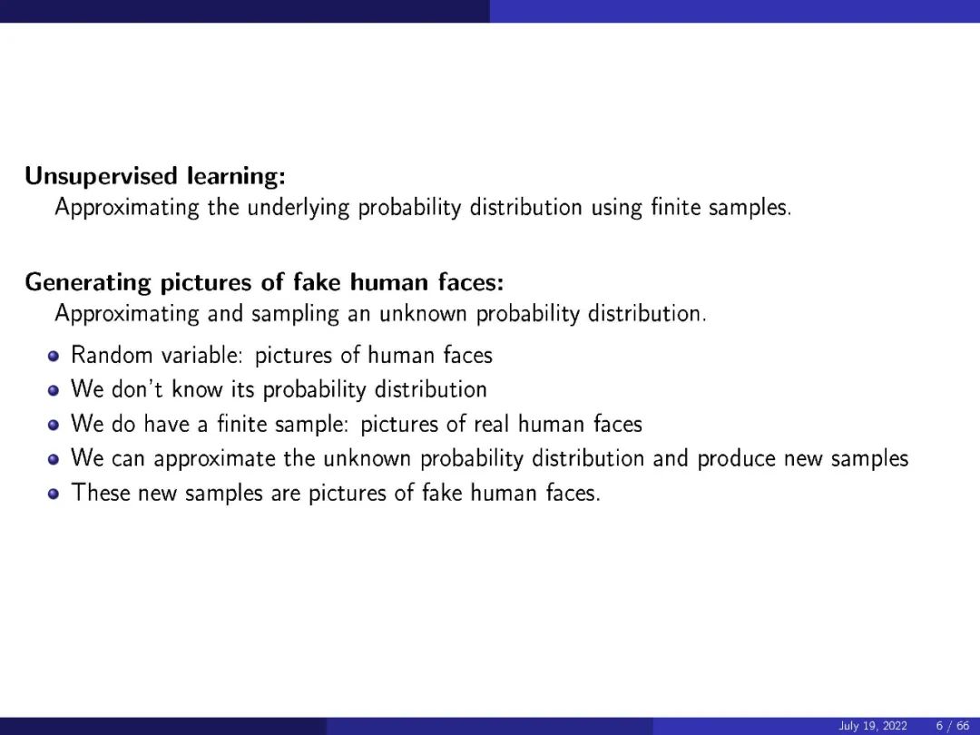 再举一个例子,在数学术语中,无监督学习是一个使用有限样本逼近潜在概率分布的问题。无监督学习的一个典型问题是生成不存在的数据,比如生成假人脸。虽然概率分布还不清楚,但我们确实有有限的真实人脸样本。用这个有限的样本,我们可以近似未知的概率分布,并产生新的样本。在其他机器学习方法中,强化学习是关于求解相关马尔可夫决策过程的Bellman方程,而时间序列学习则是关于逼近动态系统。