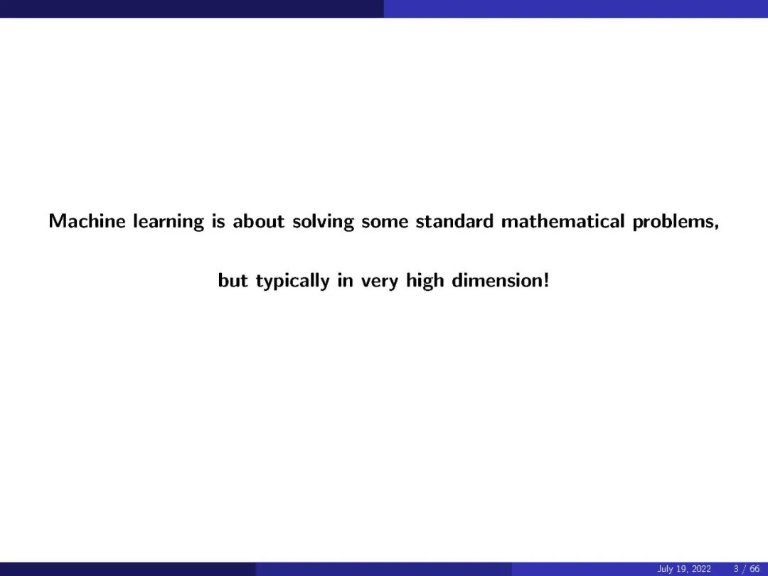 本演讲回顾了基于神经网络的机器学习数学理论领域的现状。他工作的中心主题是对高维函数的理解。他一开始就说,“机器学习是解决一些标准的数学问题,但是在非常高的维度上”。在数学的这个背景下,人们可以认为监督学习是使用有限的训练集逼近目标函数。使用图像分类的例子,我们感兴趣的函数是将每个图像映射到其类别的函数。我们知道函数在有限样本上的值(标签),目标是找到函数的精确逼近。