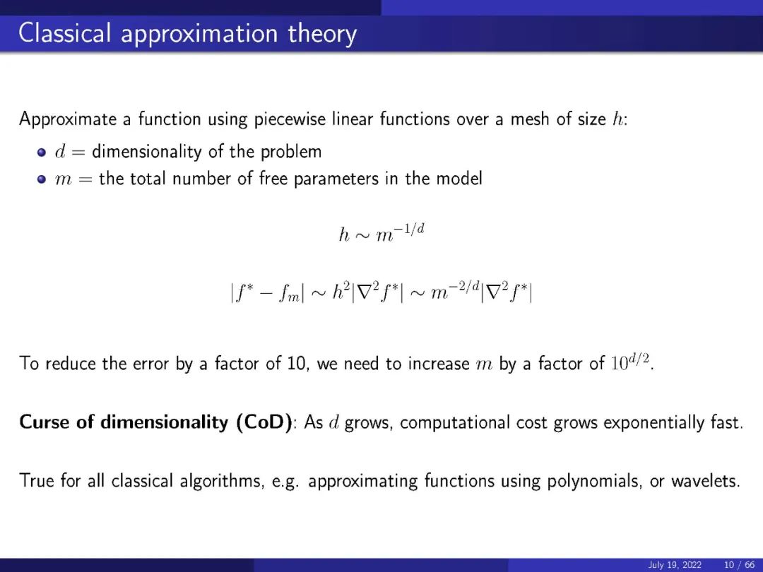 多年来,计算数学家一直在解决这类问题。唯一的区别是维度。以CIFAR-10问题为例,我们感兴趣的函数是将每个图像映射到其类别的函数。每个图像是32 x 32像素,有三个颜色维度,所以这个问题的整体维度是3072。这给经典的近似理论带来了一个问题(人们通常会在网格上使用分段线性函数逼近一个函数),因为随着问题的维数增长,计算成本呈指数增长。这对于所有用多项式近似函数的经典算法都是正确的。神经网络可以更有效地解决这类问题。