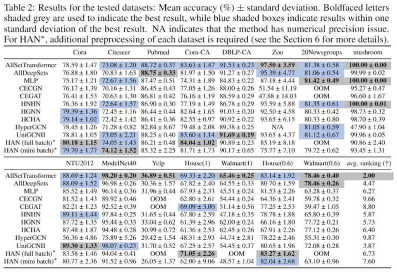 我們可以看到我們的AllSetTransformer總體來說表現最好,除cora外在6個數據集上取得最佳表現與在其餘的數據集與最佳模型表現相似。而其他模型都至少在兩個數據集上表現不佳。例如最強的基線(baseline)模型UniGCNII [Huang et al. 2021 IJCAI]在Yelp 以及Walmart上表現明顯差於AllSetTransformer。此一結果也凸顯的僅在基本的引用網絡數據集測試超圖神經網絡是不足的,我們必須增加更多不同的超圖數據集已確保超圖神經網絡的泛用性。