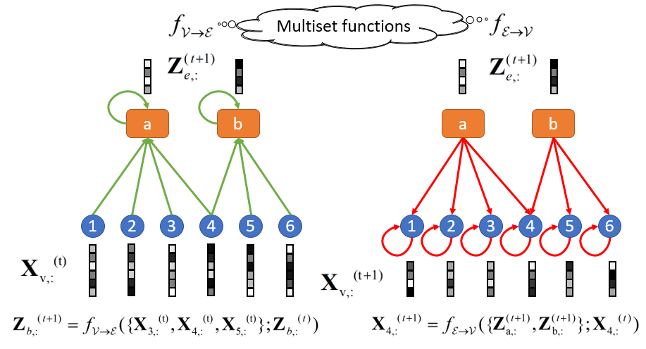 其中 , 為兩個多重集函數。注意,這裡我們也假設了 , 皆有完整的超圖拓譜信息 ,使其能還原度正則化(degree normalization)。