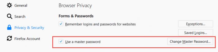 Firefox 向用户提供了一个可选的主密码系统保存浏览器记录的网站密码。但专家指出,Firefox 使用的加密方法不安全,很容易被暴力破解。AdBlock Plus 扩展作者 Wladimir Palant 表示他检查了源代码,发现加密功能使用 SHA-1 函数哈希一个由随机盐和主密码组成的字符串,SHA-1 函数只迭代一次,而行业标准是至少迭代一万次。