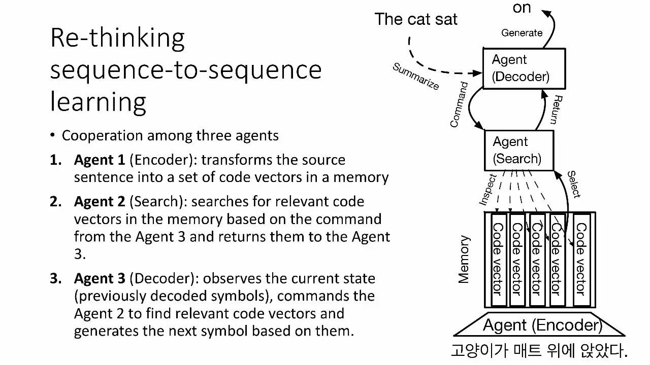 Agent 3(解码器):观察当前状态(先前解码的符号),命令Agent 2去搜索相关的代码向量并基于它们生成下一个符号。