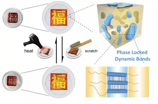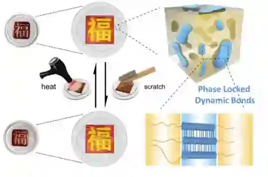 在国家自然科学基金委的支持下,中国科学院化学研究所工程塑料重点实验室研究员董侠等致力于智能材料的开发与应用,取得了系列进展(J. Polym. Sci. Part A: Poly. Chem. 2015, 53, 2094-2103; Polymer 2016, 84, 1-9; Mater. Chem. Front. 2017, 1, 111-118; ACS Appl. Mater. Inter. 2017, 9, 30046-30055; Macromolecules 2018, 51, 1100-1109)。在此基础上,从分子设计角度出发,提出了一种新型自修复设计策略“Phase Locked Dynamic Chemical Bonds(相锁定动态化学键)”,成功制备出无色透明、可快速自修复的高韧高强聚合物。