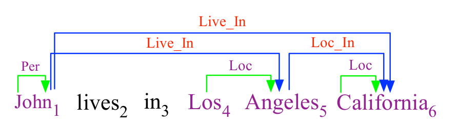 实体和关系抽取是信息抽取领域的的重要研究问题。如图1所示,其输入是非结构化文本,输出则是识别出的实体及其对应的语义关系。其中,实体与关系之间、以及关系与关系之间都存在着很强的关联性。例如,Live_In关系往往对应着 Person 和 Location两种实体,反之亦然。Live_In关系(对应实体“John” 和实体 “California”) 可以由Live_In关系(对应实体 “John” 和实体 “Los Angeles”) 和 Loc_In关系(对应实体 “Los Angeles“ 和实体 “California”)推理出来。