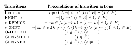 的父节点和祖先节点。另外,当β的顶部元素是单词时,所有关系动作都将被禁止。O-DELETE从β中弹出wj。GEN-SHIFT将wj从β移动到e。GEN-NER(y) 弹出e顶部的所有元素,创建一个“块”,用标签y标记这个块,将这个块的表示压入β中,生成的实体被添加到E。当β的顶部元素是实体时,所有实体动作都将被禁止。另外,如表 2所示,每个动作都需要满足一定的先决条件,以确保生成的实体和关系有向图的合理性。