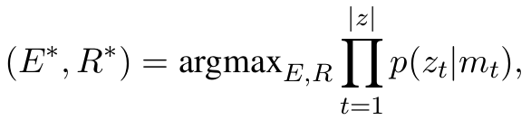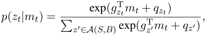 其中gz表示转换动作z的列向量,qz是动作z对应的偏置项。集合A(S, B)表示在当前状态下可以采取的合理操作的集合。给定输入句子,任何合理的动作序列z的概率可以表示为: