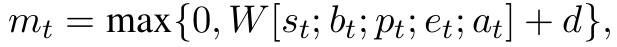 其中W是要学习的参数矩阵,st是σ的表示形式,bt是β的表示形式,pt是δ的表示形式,et是e的表示形式,at是A的表示形式,d是一个偏置项。