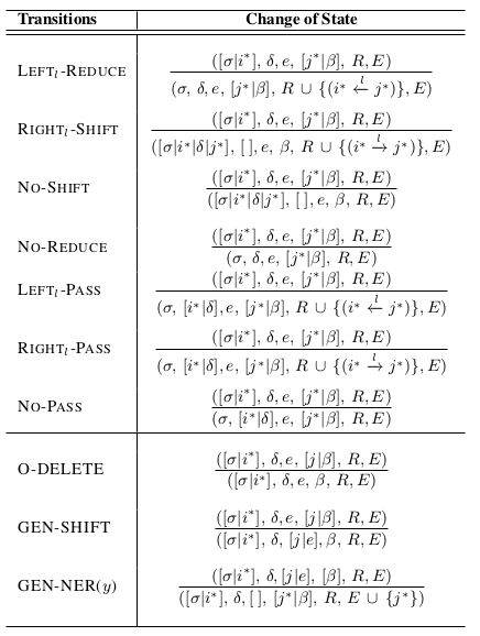 基于以上观察,我们通过设计一套转化规则,将实体识别和关系抽取联合任务转化为一个有向图的生成问题,并使用基于转移的方法来直接生成该有向图。如图1所示,与传统的句法任务不同,我们的输出结构中每个节点可能含有多个或零个父节点。因此,我们提出了一种新的转移系统,通过递增的融合实体信息及其相应的关系信息,我们的方法不仅可以对实体和关系之间的关联性进行建模,而且还可以很好的表示关系之间的关联性。