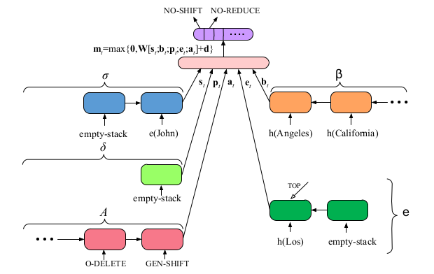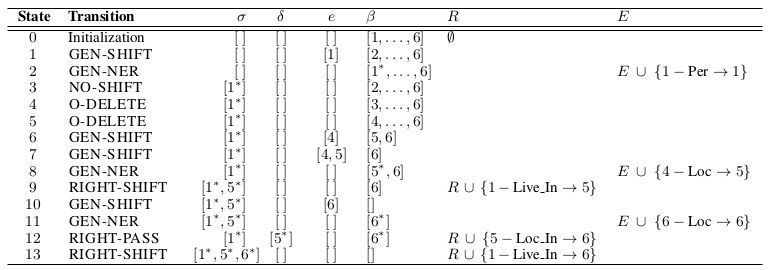 因此,实体识别和关系抽取联合任务就被集成到我们的转移系统中。在测试的时候,我们的算法贪心的选择最大概率的动作,直到满足终止状态条件。