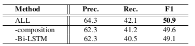 我们将我们的方法跟之前的串联方法,联合方法等进行对比。结果如表4所示,我们的基于图的方法获得了最高的F1-score,另外,模型的准确率也是最高的。为了验证各个模块的性能,我们做了消融实验。结果如表5所示,我们发现在初始化β时候采用的双向lstm表示,以及针对关系之间的联系而设计的递归递归神经网络对性能提升有很重要的影响。更多具体的实验分析可以参考我们的英文原文。