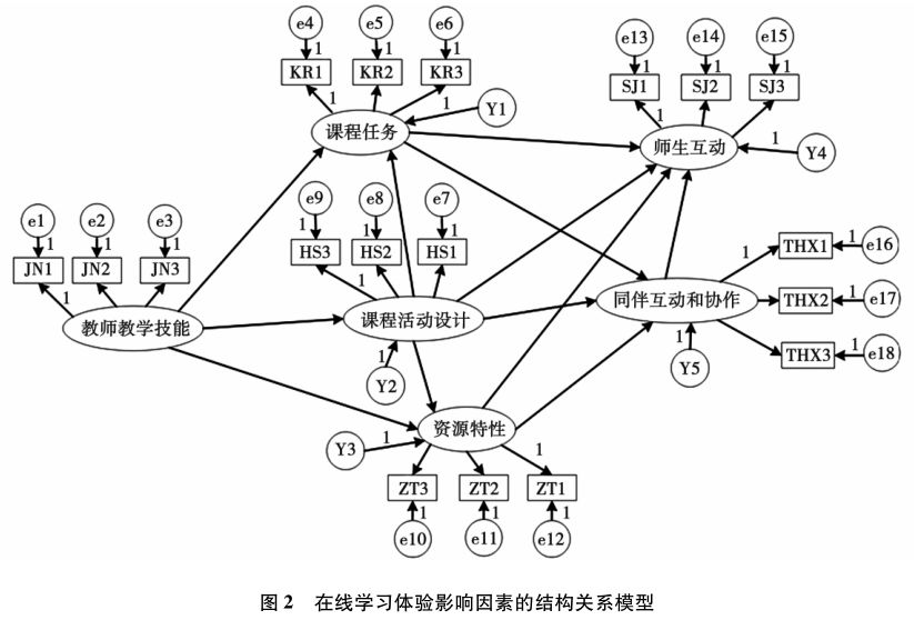 国内外涉及在线学习体验影响因素的相关成果主要有:Young B J研究了学习者之间的个体差异(包括意愿和动机、自控能力、决策能力、技术能力等)对网络学习体验的影响情况[6];Kyung-Sun Kim等探究了信息素养、学习方式、师生及同伴互动对在线学习体验的影响,结果显示师生及同伴互动、信息素养可显著预测学生的在线学习体验,而学习方式对在线学习体验没有显著影响[7],Maier等通过对2196名学习者的网络体验进行调查后提出,其影响因素主要包括网络学习环境、网络学习资源、个体学习过程、师生及同伴互动、网络学习效果等[8]。Douglas Colbeck等调查了合作学习对在线学习体验的作用,探究如何设计适宜的合作学习活动以提高学生的线上体验[9]。刘斌等通过文献研究系统地讨论了网络学习体验影响因素间的结构关系,提出网络学习体验的关键影响因素主要有学习环境、活动设计、教师(助教)、学生主体和互动行为[10],但并未利用数据加以佐证。山峰等运用问卷调查、访谈及日志分析的方法对影响艺术类专业学生在线学习体验的各类因素进行了研究[11]。李佳赟以问卷形式对学生的基本信息、个体学习风格、平台体验、活动体验和学习效果进行了调查,以此来探究学生在MOOC课程中的体验情况及学生的基本特征、学习风格和学习体验三者间的关系[12]。