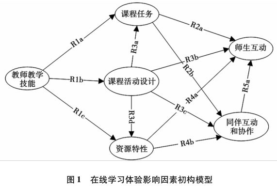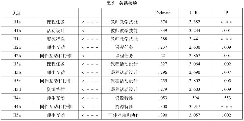 依据上述模型,可得出影响因素间的12个关系。分别是:R1a教师教学技能对课程任务有正向显著影响;R1b教师教学技能对课程活动设计有正向显著影响;R1c教师教学技能对资源特性有正向显著影响;R2a课程任务对师生互动有正向显著影响;R2b课程任务对同伴互动和协作有正向显著影响;R3a课程活动设计对课程任务有正向显著影响;R3b课程活动设计对师生互动有正向显著影响;R3c课程活动设计对同伴互动和协作有正向显著影响;R3d课程活动设计对资源特性有正向显著影响;R4a资源特性对师生互动有正向显著影响;R4b资源特性对同伴互动和协作有正向显著影响;R5a同伴互动和协作对师生互动有正向显著影响。