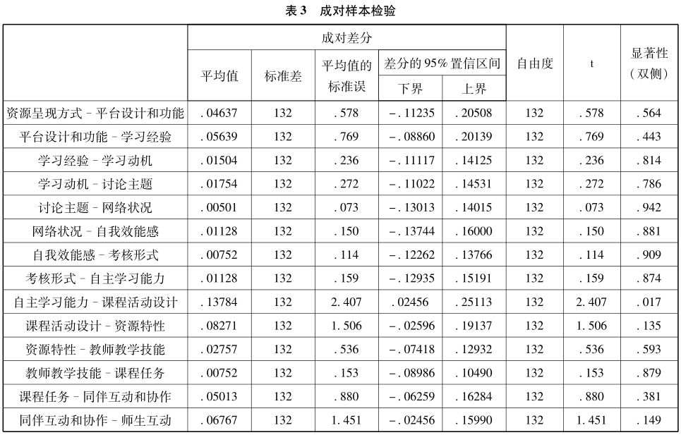 为明确区分影响在线学习体验的次要因素和关键因素,还需进行成对样本检验。按平均值从小到大依次成对,由SPSS软件输出成对样本检验的结果如表3所示。由表3可知,自主学习能力与课程活动设计一组的显著性p值是0.017,有显著差异。因此可以确定影响在线学习体验的关键因素是师生互动、同伴互动和协作、课程任务、教师教学技能、资源特性和课程活动设计,其余均为次要影响因素。