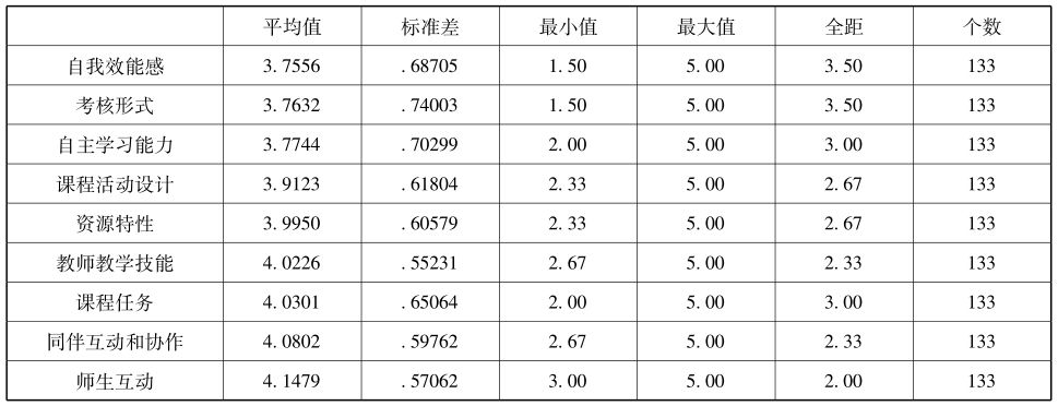 对收集到的141份问卷进行筛选,排除无效问卷后共获得133份有效问卷。接着采用cronbach’s Alpha系数对问卷的信度予以检验,结果显示,问卷整体信度Alpha系数值是0.933,每个维度信度Alpha系数值都在0.714至0.876之间,表明问卷在整体和各维度上都有较好的信度。关于问卷的效度,在此主要采用了探索性因子分析来检验问卷的建构效度。首先,以每个层面的KMO值和Bartlett显著性概率值来判断是否可以进行因素分析。在确定了所有层面的KMO值都超过0.745和Bartlett显著性概率值全部达到显著的基础上,运用限定抽取共同因素法,分别把每个层面的所有题项均选入到程序中。通过萃取共同因素,并依据输出的“旋转成分矩阵”表来判断各因素所含题项与原问卷题项是否一致。在完成信效度检验后,学习经验、学习动机、自我效能感、平台设计和功能、自主学习能力五个因素所含题项中均有一题被删除,最终确定的问卷第二部分包含38道题项。此时问卷整体具备了较好的信效度,可以对其进行分析。