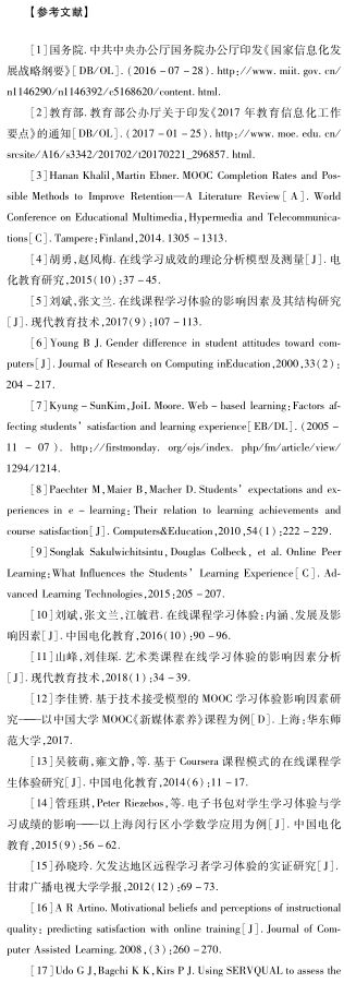 《国家信息化发展战略纲要》中提议要加大教育信息化推广力度,建立网络环境下开放式的学习模式,推动更多学校使用网络课程[1]。教育部办公厅颁布的《2017年教育信息化工作要点》也明确指出,有必要组织推行在线教育普惠行动,深入贯彻落实《关于加强高校在线开放课程建设应用与管理的意见》[2]。可见,在线学习已经成为当今时代教育发展的一个主要趋势。MOOCs进一步加速了在线学习的发展,将在线学习推到了前所未有的高度,成为教育研究者们广泛应用和重点研究的对象。然而,在线学习的实际效果还未达到人们的期望,学生参加线上学习的积极性不够,在线学习时易出现焦虑、无助、学习效率低等问题[3]。不少师生对于线上学习能够取得与面授教学相当的效果表示质疑[4]。为解决这些现实问题,研究者们逐渐由关注在线学习的理念、模式、特征、学生成绩等转移到学生的内部心理、情感、反应等一些微观层面。至此,在线学习体验开始受到人们的关注[5]。在线环境中学习者的体验受多种因素影响[5],研究其结构关系不仅能为网络技术应用于实践教学提供有效的理论基础,而且有助于教师从学生的角度来改善课程建设和活动设计。