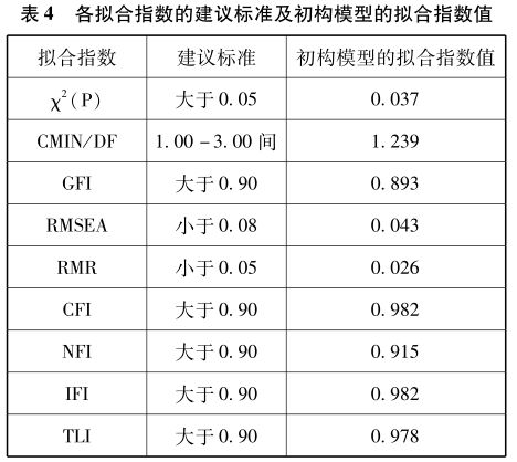 模型的拟合指数用来判断前面所建立的初构模型与所得数据的一致程度。拟合指数值是否达到标准一般由绝对拟合指数与增值拟合指数来判断,具体包括X2(p值)、CMIN/DF、GFI、RMSEA、RMR、CFI、NFI、IFI、TLI等。各拟合指数值的建议标准及由Amos输出结果得到的初构模型拟合指数值如表4所示。