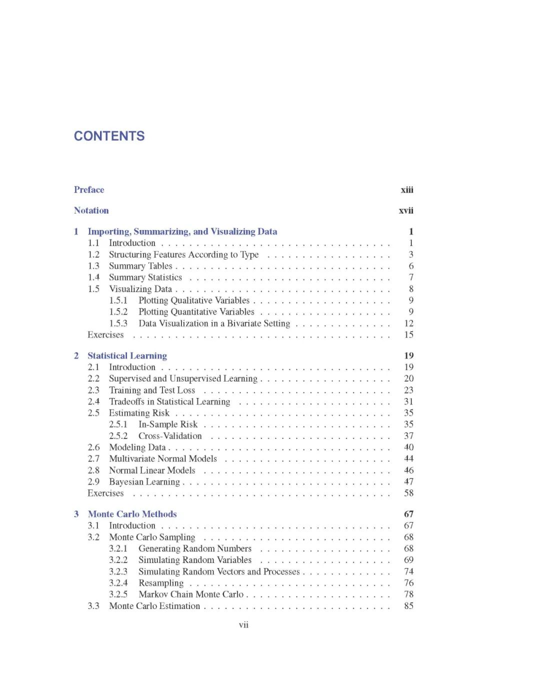 数据科学为理解和处理数据提供了必要的语言和技术。它涉及数值数据的设计、收集、分析和解释,目的是提取模式和其他有用的信息。机器学习与数据科学密切相关,涉及从数据中学习的算法和计算机资源的设计。本书的组织大致遵循数据科学项目的典型步骤:收集数据以获得关于研究问题的信息;数据的清理、汇总和可视化;数据建模和分析;将关于模型的决策转化为关于研究问题的决策和预测。由于这是一本以数学和统计为导向的书,大部分重点将放在建模和分析上。