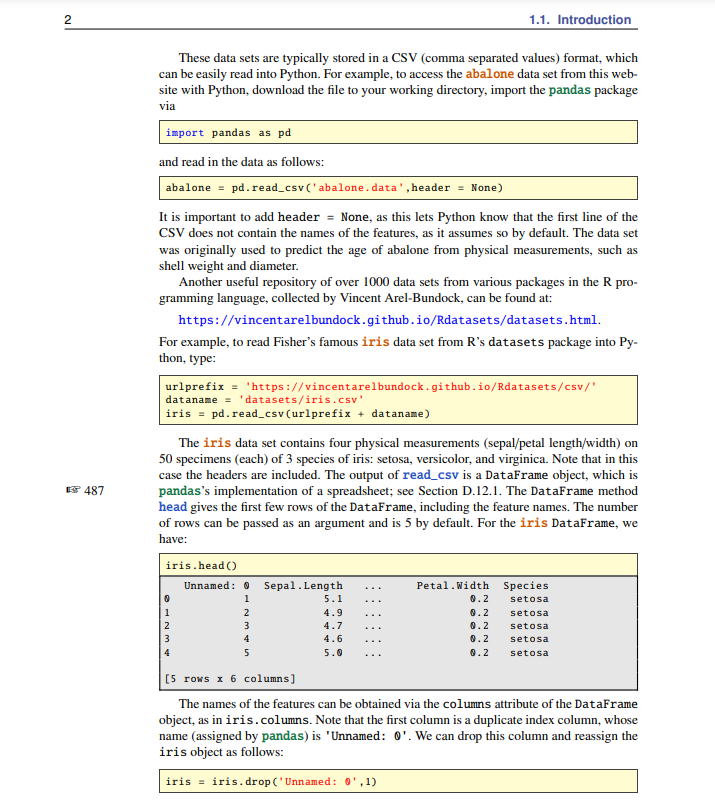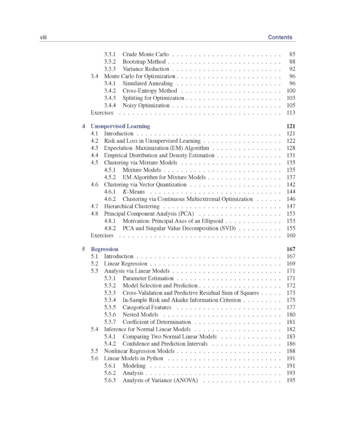 我们从第一章开始,使用Python中的数据操作包、结构化、总结和可视化数据。虽然本章中涉及的材料不需要数学知识,但它为数据科学形成了一个明显的起点:更好地理解可用数据的性质。在第二章中,我们介绍统计学习的主要成分。我们区分监督和非监督学习技术,并讨论我们如何评估(非)监督学习方法的预测性能。统计学习的一个重要部分是数据建模。我们介绍了数据科学中各种有用的模型,包括线性、多元高斯和贝叶斯模型。机器学习和数据科学中的许多算法使用蒙特卡洛技术,这是第3章的主题。蒙特卡洛可以用于模拟、估计和优化。第四章讨论了无监督学习,其中我们讨论了密度估计、聚类和主成分分析等技术。然后我们将注意力转向监督式学习然后,我们将在第5章中把注意力转向监督学习,并解释一大类回归模型背后的思想。在其中,我们还描述了如何使用Python的statmodels包来定义和分析线性模型。第6章建立在前一章回归的基础上,发展了核方法和正则化的强大概念,这使得第5章的基本思想可以以优雅的方式得到扩展,使用重建核希尔伯特空间的理论。在第7章中,我们继续进行分类任务,它也属于监督学习框架,并考虑了各种分类方法,包括贝叶斯分类、线性和二次判别分析、k近邻和支持向量机。在第8章,我们考虑回归和分类的通用方法,利用树结构。最后,在第9章,我们考虑了神经网络和深度学习的工作方式,并表明这些学习算法有一个简单的数学解释。在每一章的末尾都提供了广泛的练习。