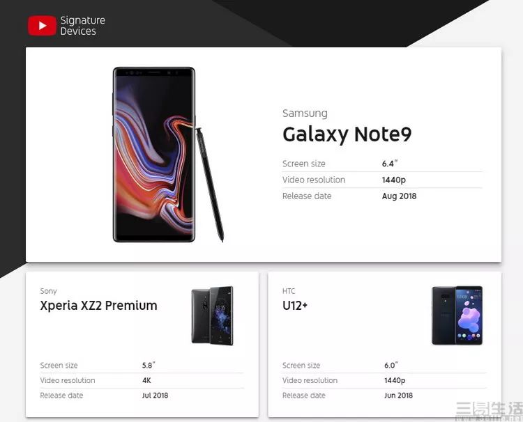 这个认证包含哪些内容?YouTube给出了详细的技术标准,你的手机必须要支持4K解码、HDR(高动态范围)、HFR(高帧率显示)、VP9解码、DRM(内置版权保护)、360度VR兼容等一系列豪华特性,才有资格享受到最高级别的在线视频享受。当然,如果你看不懂这些,也可以直接看官方推荐的认证设备列表:排第一位的就是刚刚在海外发布的,全新的安卓机皇三星Galaxy Note9。而除了它之外,剩下的设备,也基本上都是售价在4000元以上的一线超旗舰机型……
