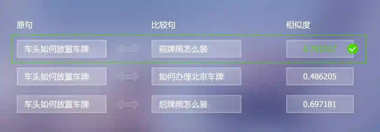 能够提供不同短文本之间相似度的计算,输出的相似度是一个介于 -1 到 1 之间的实数值,越接近 1 则相似度越高。这个相似度值可以直接用于结果排序,也可以作为一维基础特征作用于更复杂的系统。