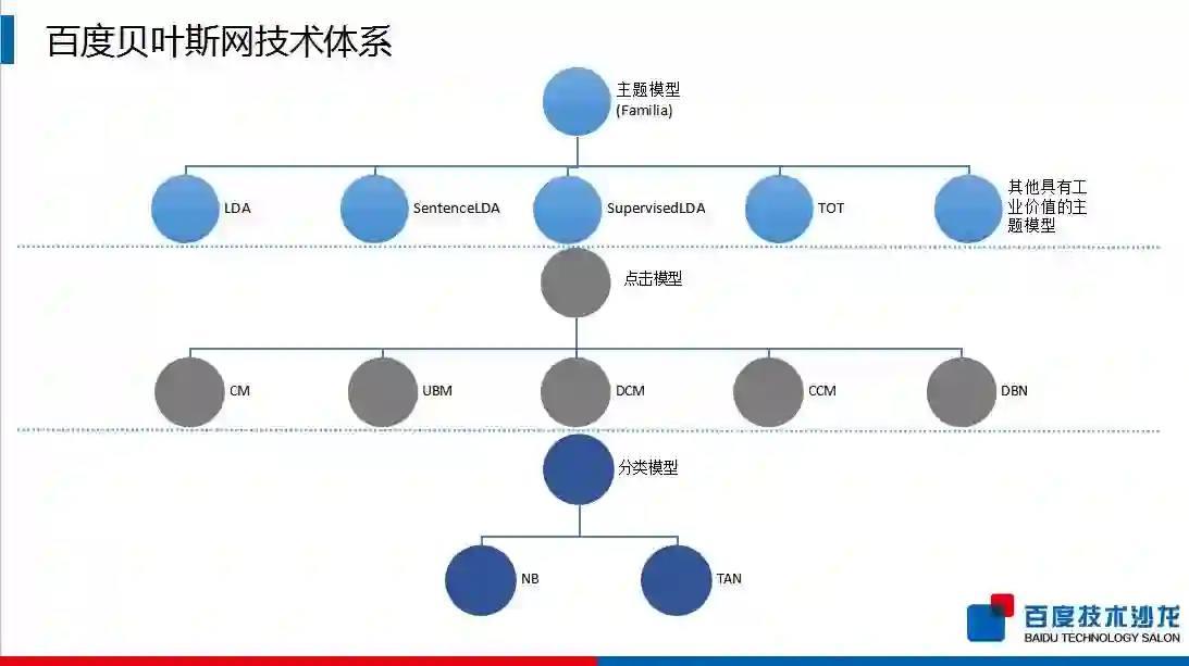百度有一个贝叶斯技术体系的框架,主要分三大类:第一类是主题模型,这个框架的特点就是它有一个自配置的功能;第二类是点击模型,主要是应用在搜索引擎的领域,来量化分析用户的搜索行为以及搜索查询和网页的相关性;第三类是分类模型,包含最常见的基于贝叶斯网的分类器。