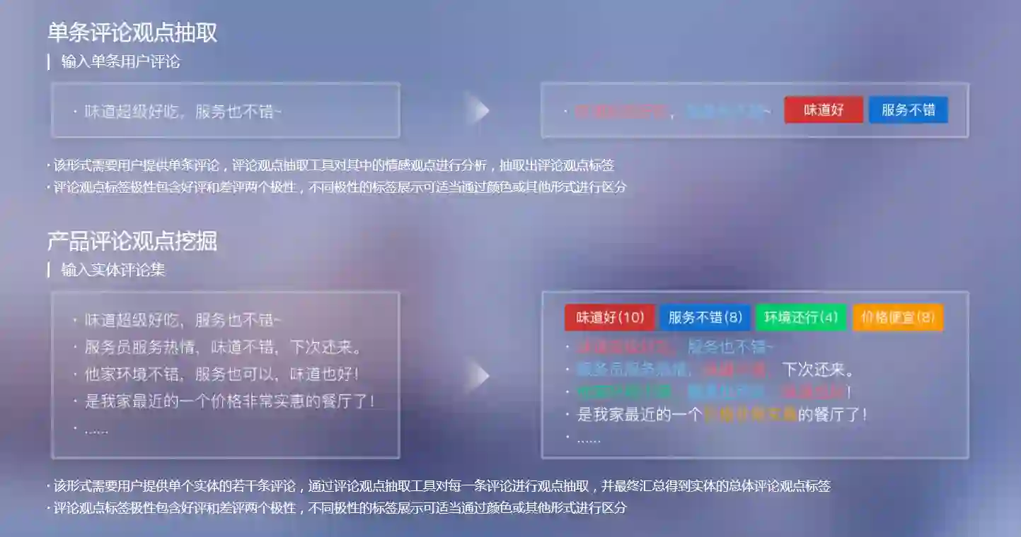 自动分析评论关注点和评论观点,并输出评论观点标签及评论观点极性。目前支持 13 类产品用户评论的观点抽取,包括美食、酒店、汽车、景点等,可帮助商家进行产品分析,辅助用户进行消费决策。