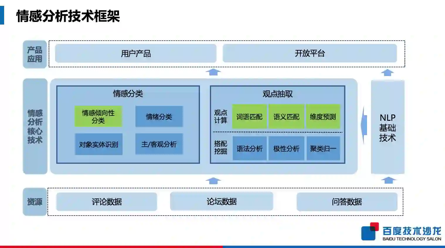 NLP 技术基于大数据、知识图谱、机器学习、语言学等技术和资源,并可以形成机器翻译、深度问答、对话系统的具体应用系统,进而服务于各类实际业务和产品。