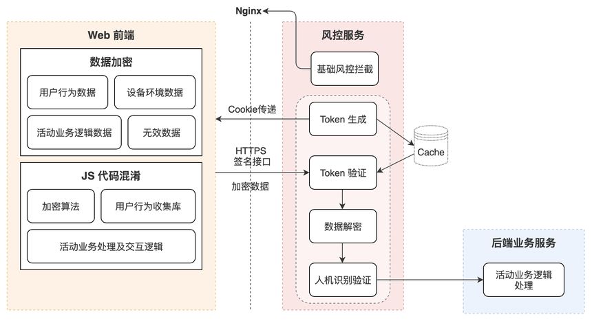 Web 前端:用户通过 Web 页面来参与活动,同时 Web 前端也会收集用于人机识别验证的用户交互行为数据。由于不同终端(移动端 H5 页面和 PC 端页面)交互形式不同,收集用户交互行为数据的侧重点也会有所不同。
